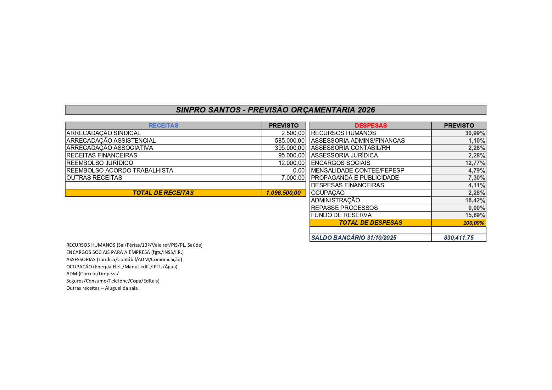 A Previsão Orçamentária foi apresentada as professoras associadas e aos professores associados,  após discussão e esclarecimentos, os presentes deliberaram pela aprovação por unanimidade da Previsão Orçamentária para o ano de 2026, e também pela aprovação por unanimidade da Contribuição para sustentação financeira do Sindicato em 2026 (Mensalidade Associativa e Contribuição Assistencial na Educação Básica e no Ensino Superior).