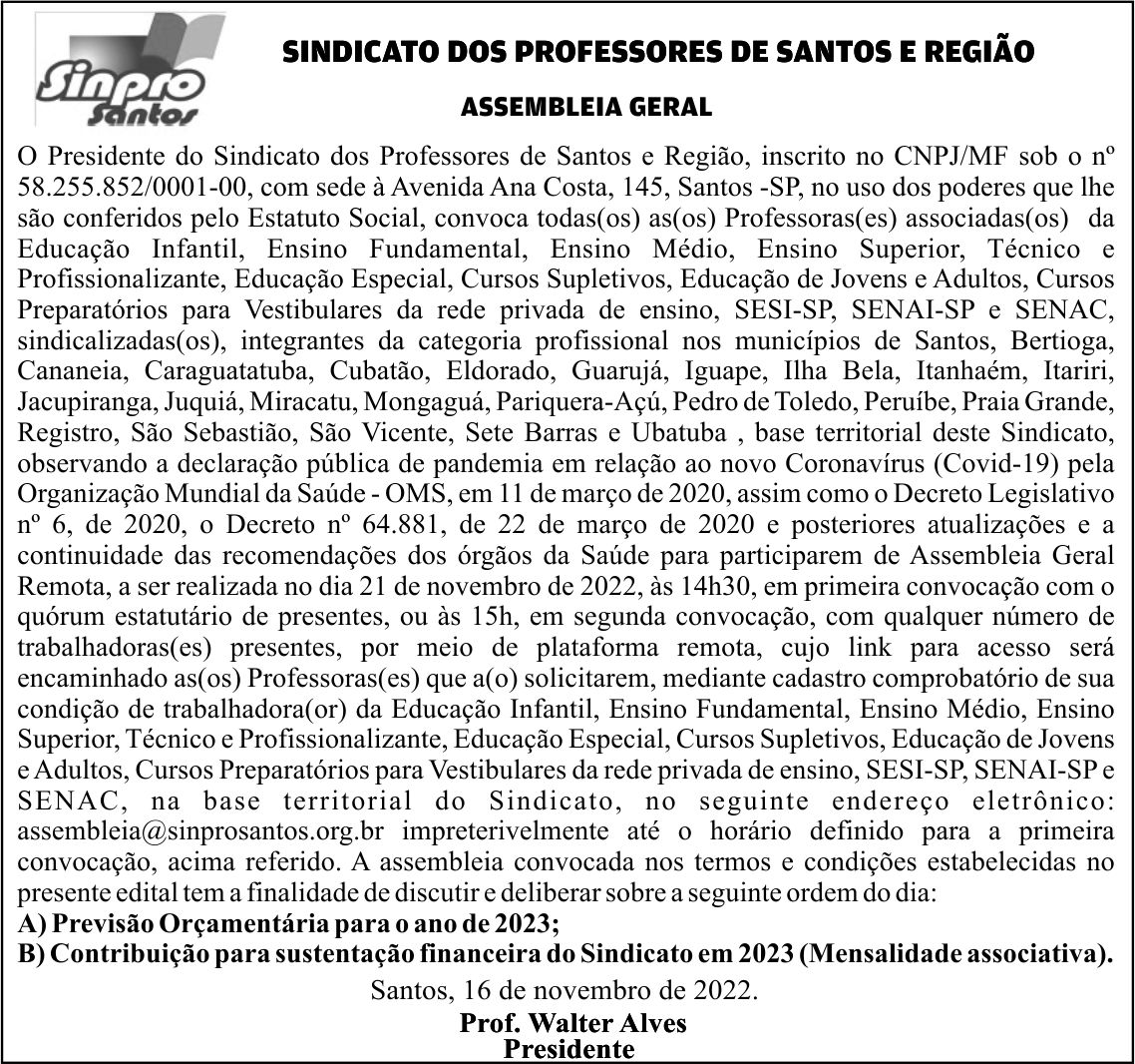 Faça a sua inscrição antecipadamente pelo email assembleia@sinprosantos.org.br, para receber seu link de acesso para participação.