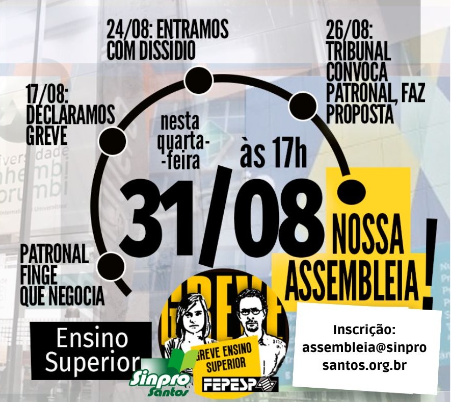 Professores e Professoras do ensino superior privado, assembleia na próxima quarta-feira, dia 31 às 17h, para deliberar sobre proposta do Tribunal Regional do Trabalho (TRT) apresentada em audiência de dissídio de greve no dia 26/08.