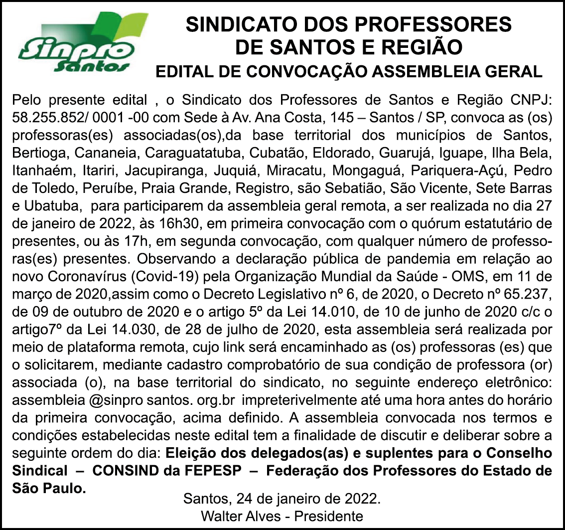 Professoras associadas e professores associados, no dia 27 de janeiro de 2022, às 17h, será realizado assembleia geral remota para eleição de delegados(as) e suplentes para o CONSIND da FEPESP – Conselho Sindical da Federação dos Professores do Estado de São Paulo. Para participar, faça sua inscrição pelo e-mail assembleia@sinprosantos.org.br, impreterivelmente até uma hora antes do horário da primeira convocação, como consta no edital abaixo.
