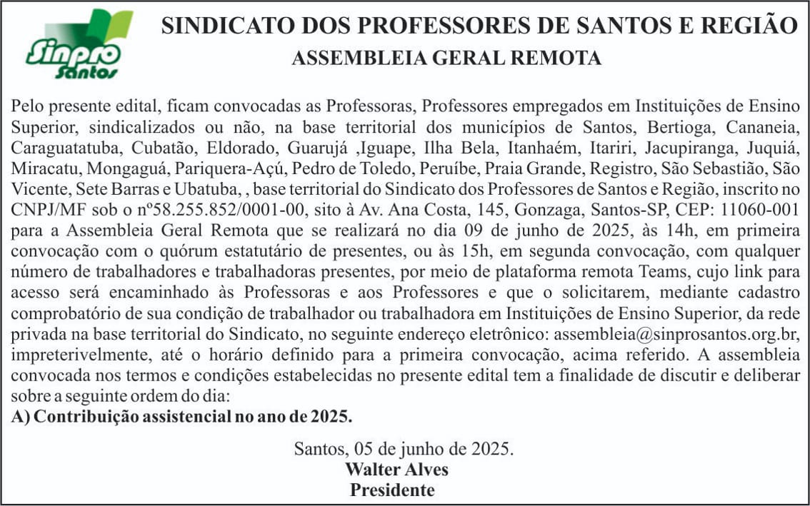 Professoras e Professores do Ensino Superior, dia 09 de junho às 15h assembleia remota. Faça sua inscrição, impreterivelmente até 14h do dia 09, pelo email: assembleia@sinprosantos.org.br (nome completo, CPF, Instituição a qual leciona).
