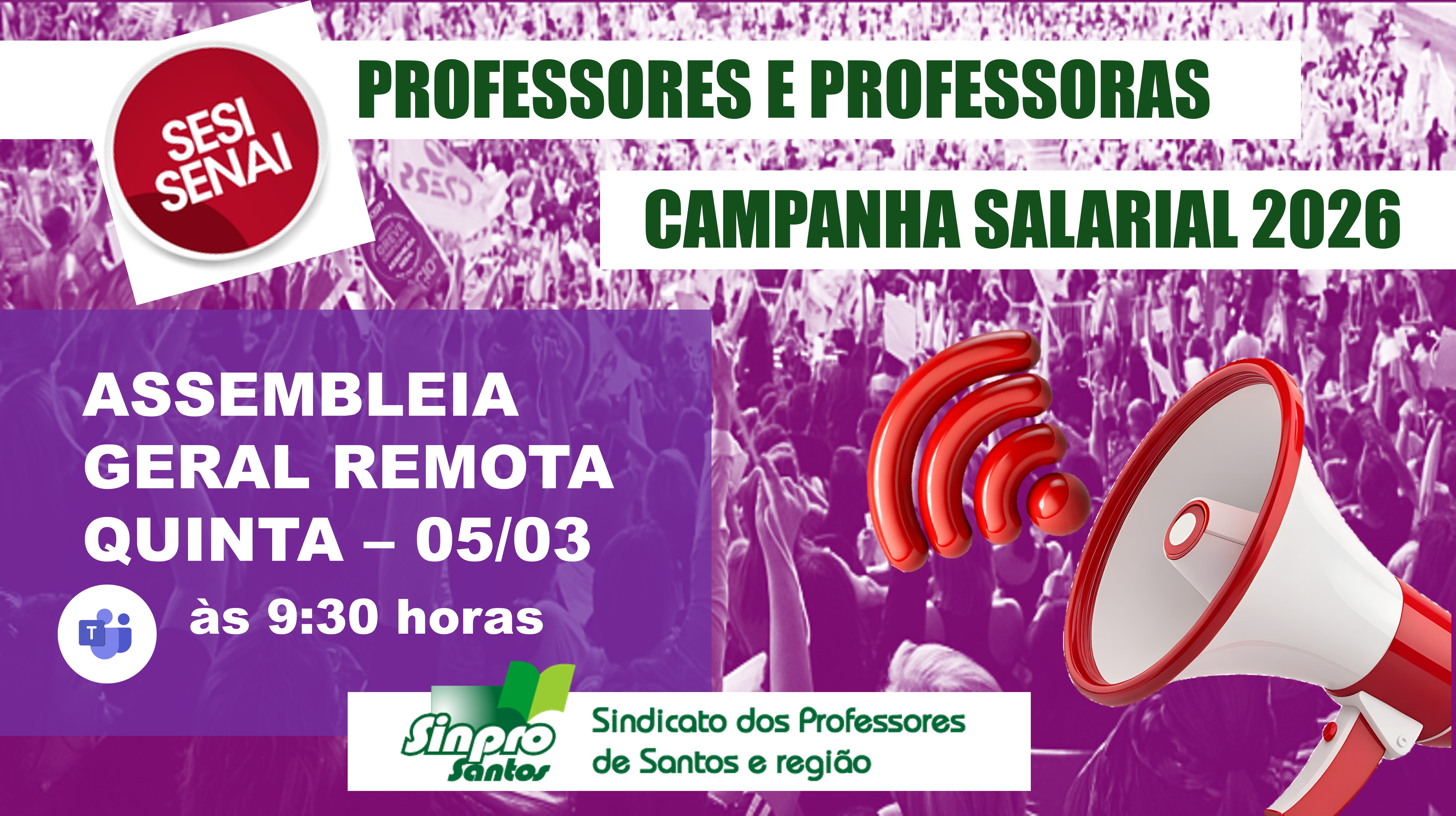 No dia 5 de março, quinta-feira, às 9h30, acontecerá a Assembleia Geral Remota dos Professoras e os Professores e as Técnicas e os Técnicos de Ensino empregados do SESI-SP e do SENAI-SP, sindicalizados ou não, dos municípios de Santos, Cubatão e Registro.