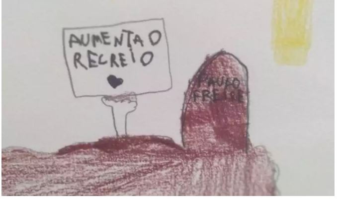 A ideia de ver Paulo Freire , educador e filósofo brasileiro, levantando do túmulo um cartaz com os dizeres “aumenta o recreio” é, no mínimo, inusitada. Agora, imagine que essa cena saiu da cabeça de uma criança de menos de 9 anos de idade. Foi isso que aconteceu na Escola da Serra, em Belo Horizonte , onde uma turma com alunos entre 6 e 9 anos fizeram cartazes e protestaram pelo aumento do tempo do recreio.