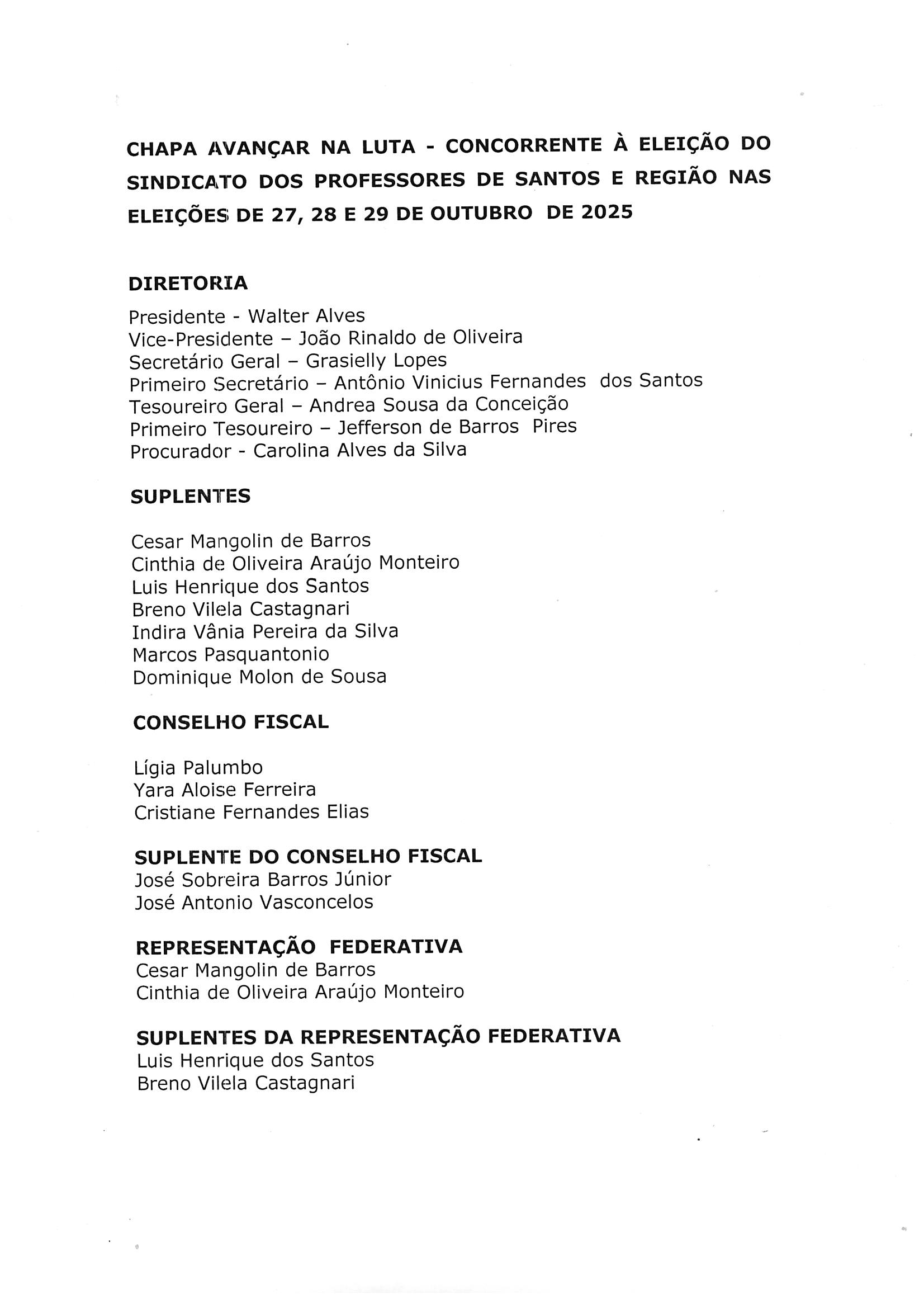 Abaixo a composição da chapa 1 – AVANÇAR NA LUTA