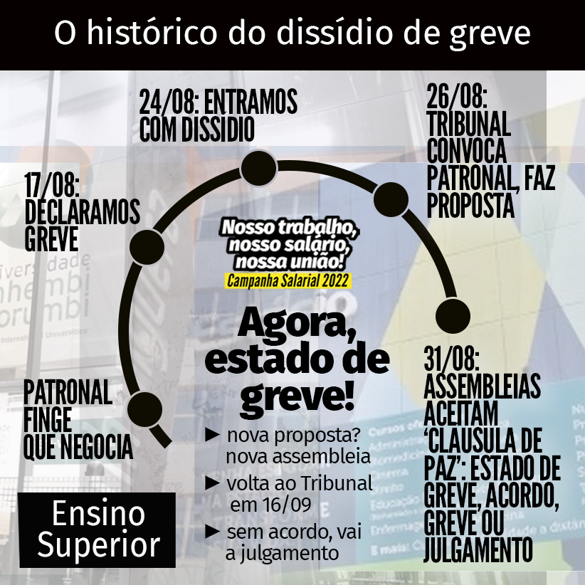 A decisão foi a mesma nas assembleias realizadas de forma simultânea em todo o Estado. Estado de greve quer dizer que nos mantemos alertas e mobilizados. Queremos um acordo junto, com reposição da defasagem provocadas nos salários pela inflação. Queremos discutir as novas condições de trabalho geradas pela expansão desenfreada do ensino remoto. Queremos também defender nossa data base de 1º de março e todas as cláusulas já conquistadas em nossa convenção coletiva de trabalho em campanhas salariais anteriores.