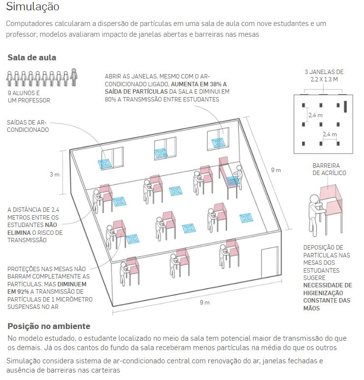 Conduzida por cientistas da Universidade do Novo México (EUA), a pesquisa usou como modelo uma sala de aula com nove estudantes e um professor, posicionados a 2,4 metros de distância entre si. A simulação considera uma sala com janelas e um sistema de ar-condicionado central, que filtra e faz a renovação do ar. No modelo estudado, até mesmo a posição do aluno na classe tem influência na quantidade de partículas que ele recebe.