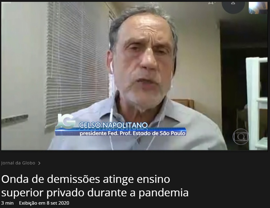 Ensino superior privado no Jornal da Globo: “Segundo o sindicato dos professores do município de São Paulo, no primeiro semestre de 2020, as maiores universidades particulares do estado, que estão na capital, demitiram 1.609 professores. Para a UNE, isso tem reflexo na qualidade de ensino”.