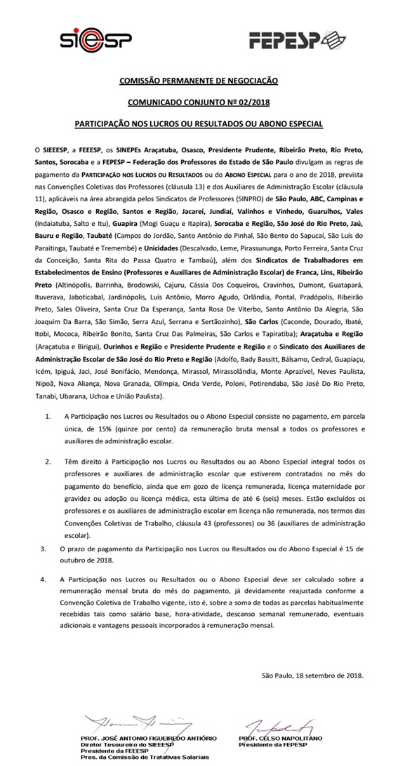 Comunicado Conjunto n°02/2018 – Participação nos Lucros e Resultados