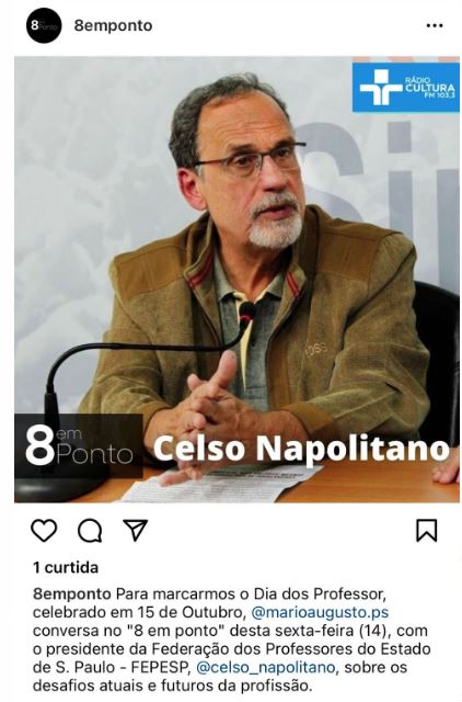 O programa Oito em Ponto da rádio Cultura FM de São Paulo entrevistou Celso Napolitano, Fepesp e SinproSP, na manhã desta sexta-feira, 14/10. O mote foi a comemoração do Dia da Professora e do Professor  neste sábado.