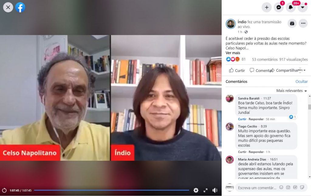 Celso Napolitano criticou a pressão pela volta às aulas apressada em conferência ‘live’ promovida pelo presidente licenciada da central Intersindical no início da tarde desta segunda-feira, 18/08.