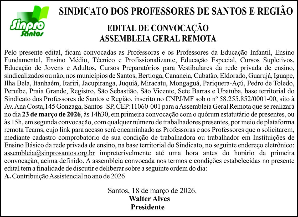 O Sindicato dos Professores de Santos e Região (Sinpro Santos) convoca toda a categoria docente da rede privada de ensino para uma Assembleia Geral Remota. O evento está marcado para a próxima segunda-feira, dia 23 de março de 2026, com o objetivo central de discutir e deliberar sobre a Contribuição Assistencial para o ano de 2026.